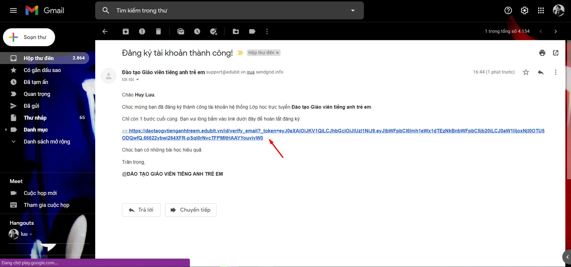 - Bước 4: Sau khi đăng ký tài khoản thành công, hệ thống sẽ gửi thư vào mail của bạn, bạn mở hòm thư và truy cập vào đường link như ảnh