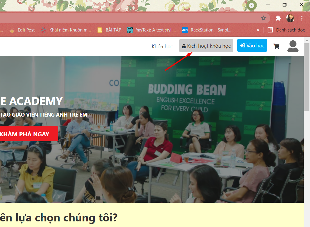- Bước 1: Truy cập vào trang chủ https://daotaogvtienganhtreem.edubit.vn/ và click vào nút "KÍCH HOẠT KHÓA HỌC"