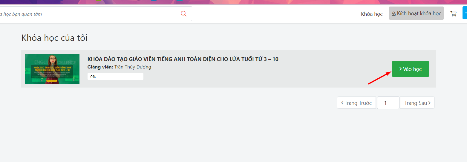 Bạn sẽ thấy khóa học hiện ra. Click vào nút "VÀO HỌC".